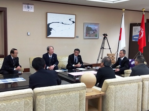 訪問したのは、本学の大倉正寿理事長、田邊裕治学長、新潟工科大学産学交流会の野崎正博会長(一正蒲鉾株式会社 代表取締役 社長執行役員)のほか、コンソーシアム構成機関の大学や工業高校の校長などで、花角知事からは各機関の課題解決に向けた期待と激励の言葉をいただきました。
