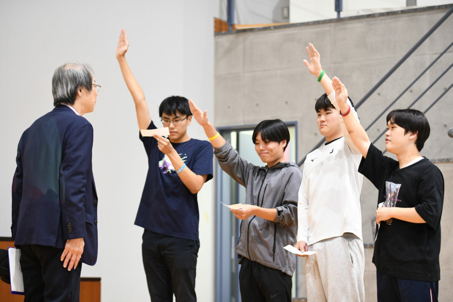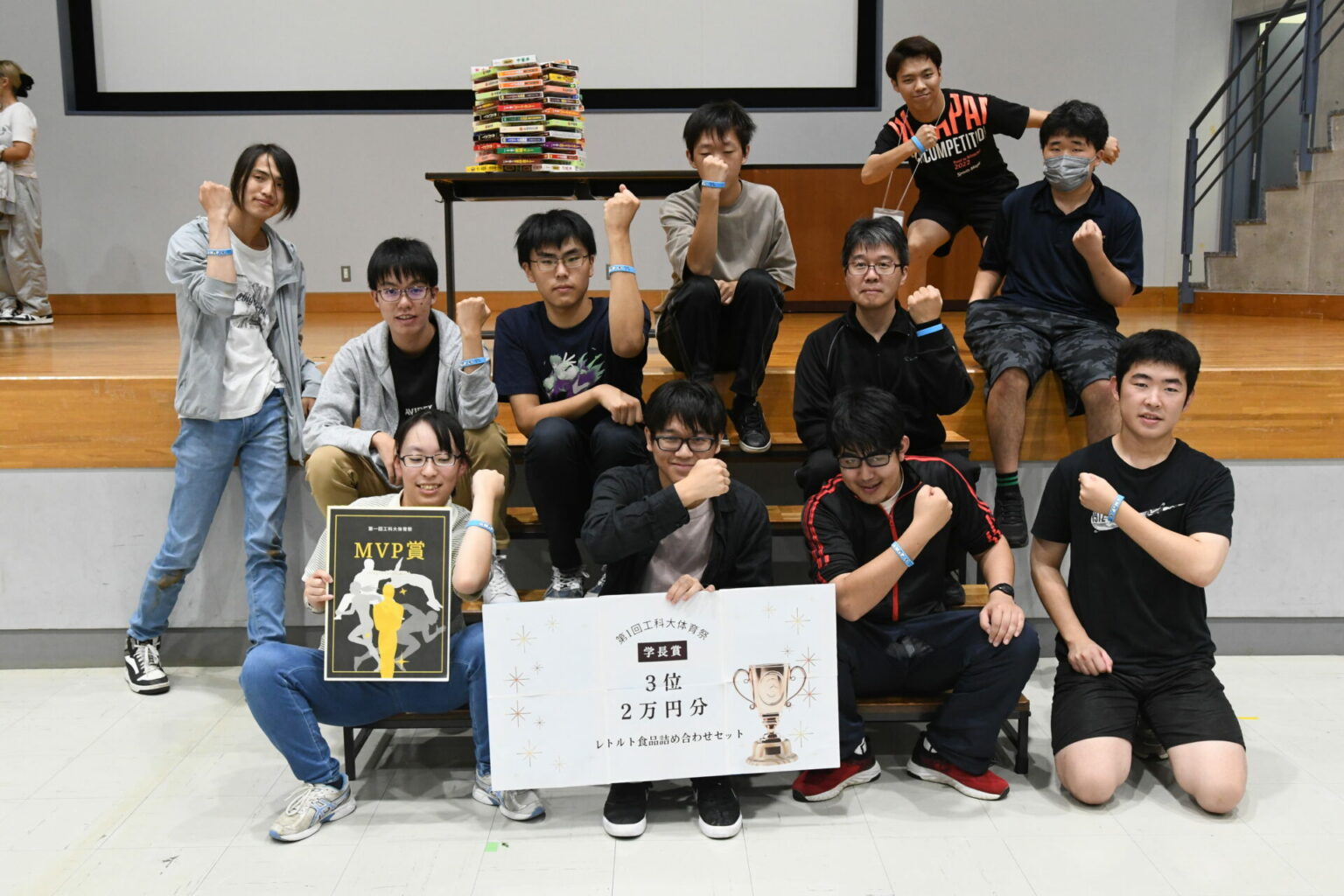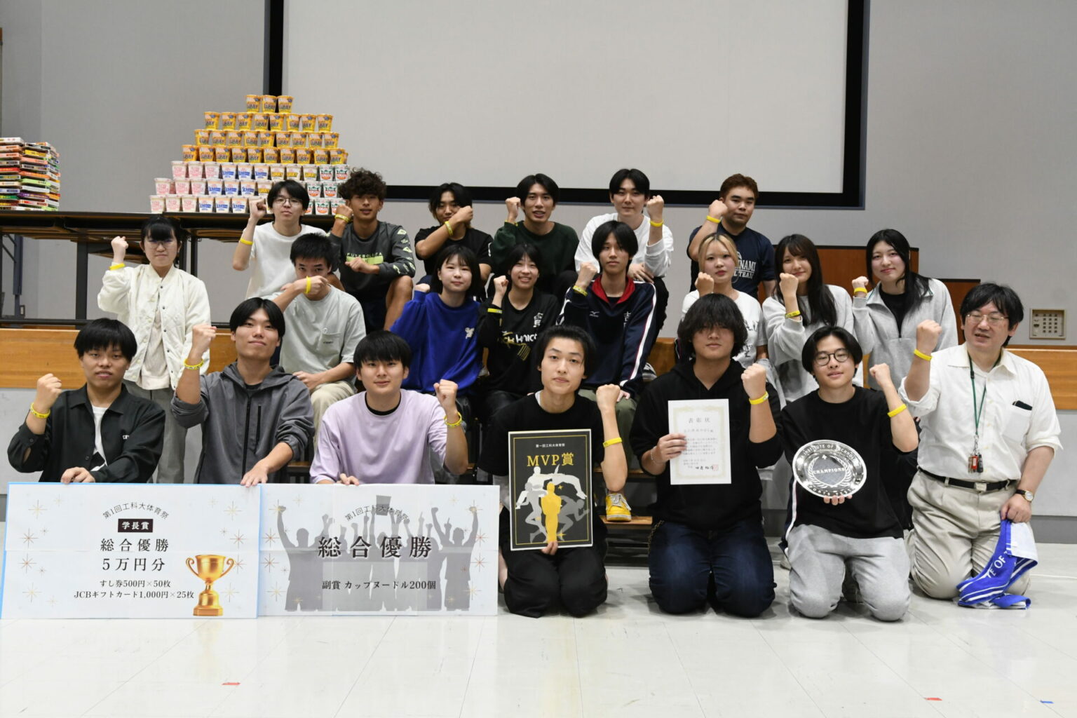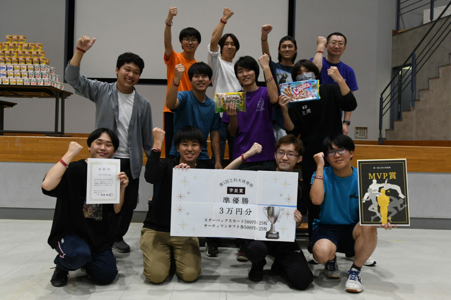 講堂での表彰式では、優勝学系に優勝シャーレと副賞「カップヌードル200個」が贈られました。