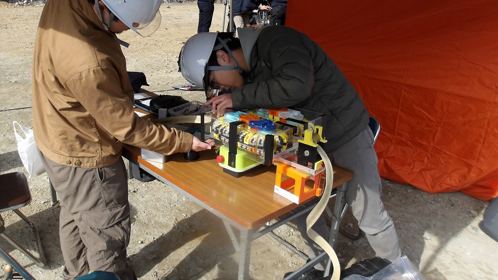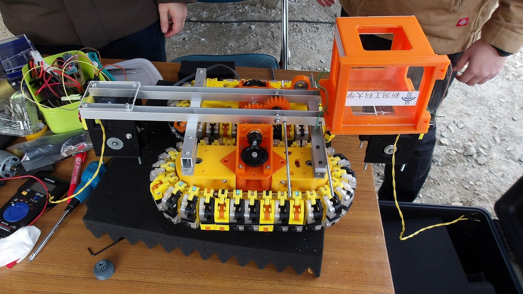 今回、ロボット・システム制御コース3年の長野恭介さんが新たに設計・製作したクライマー(昇降機械)で挑戦しました。惜しくも完走には至りませんでしたが、他チームには見られない独自の機構を採用し、会場の注目を集めました。