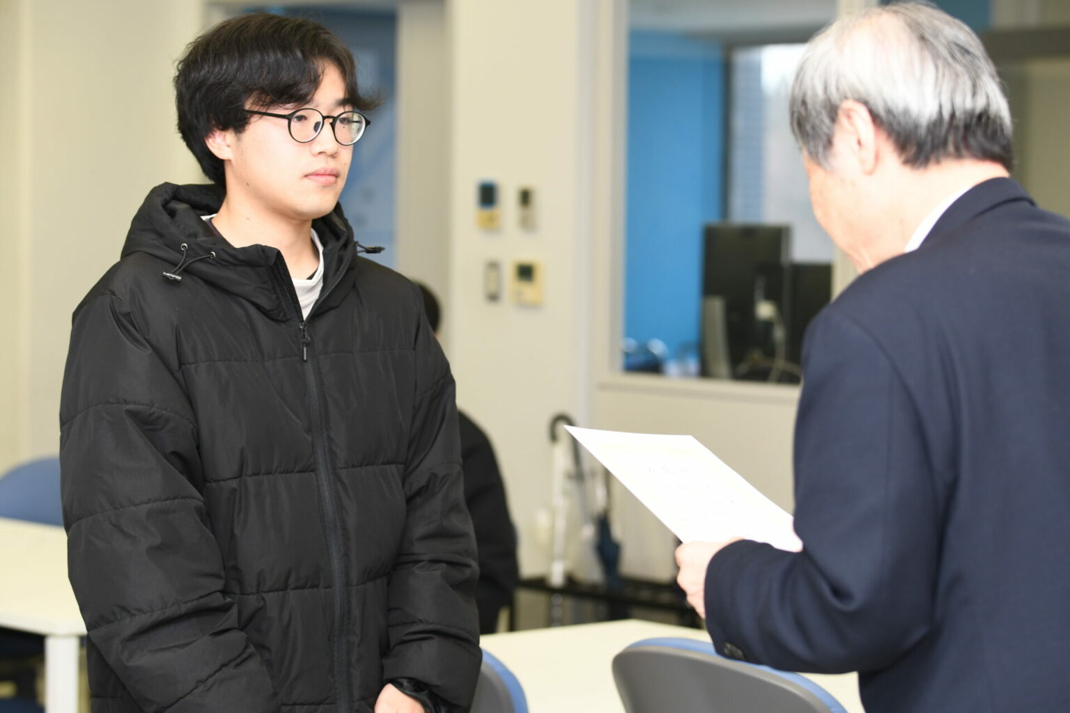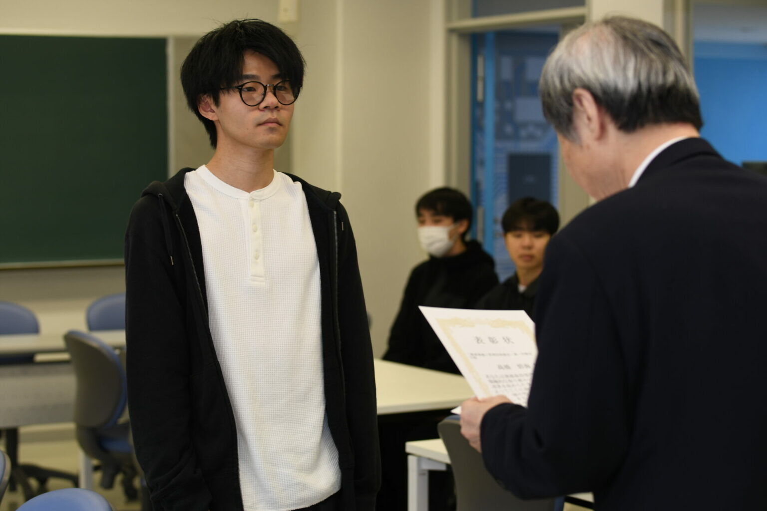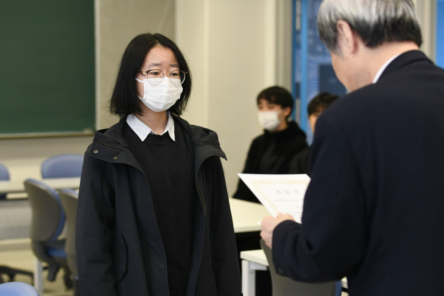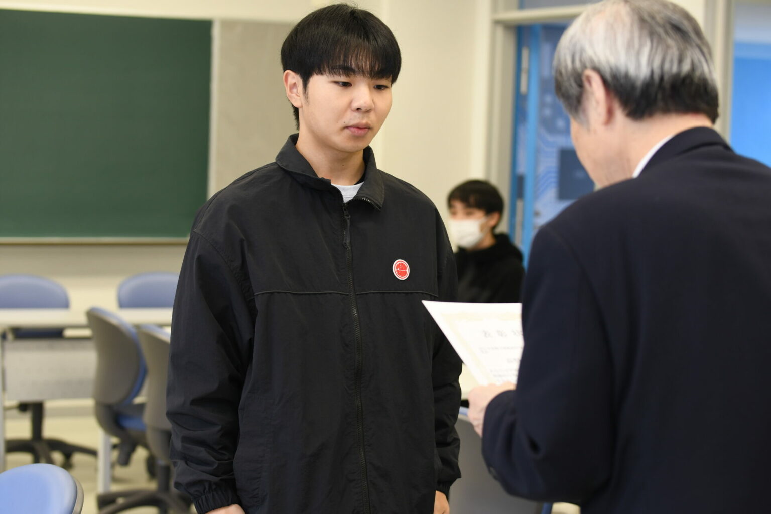 今回は資格取得部門4人(5件)、学術研究活動部門3人(3件)が対象となり、12月25日(木)に表彰されました。表彰式では、田邊󠄃学長より受賞者に賞状と副賞が手渡されました。