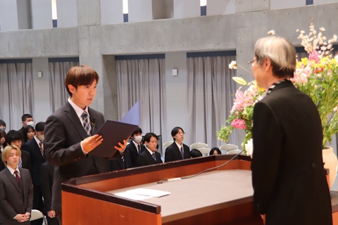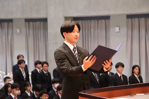 これを受け、新入生を代表して、工学部工学科の頓所毘人さん、大学院博士前期課程生産開発工学専攻の梶山雄斗さんが、誓いの言葉でこれからの学びに向けた決意を力強く述べました。