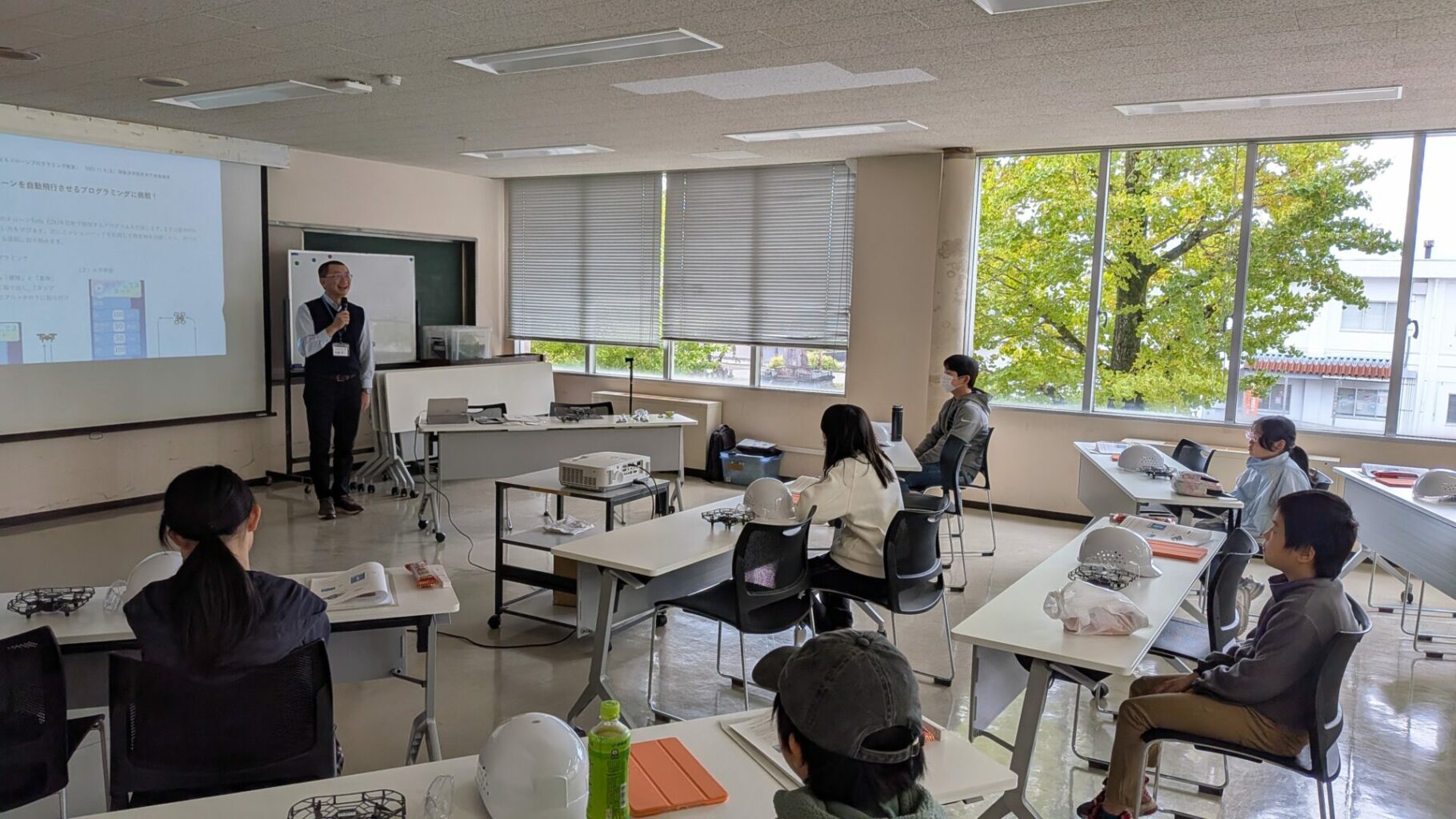当日は、午前と午後の2回に分けて実施し、南魚沼市の小学4~6年生計15名とその保護者が参加しました。教室では、本学の電子情報学系 佐藤栄一教授と学生3名の指導のもと、ドローンの歴史と将来性について学んだ後、子ども達が専用アプリ(TELLO:Scratch型)にドローンの動きをプログラミングし、自動飛行することに成功しました。