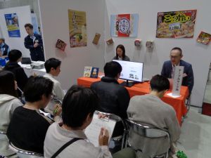 本会は、新潟県から採択を受けた「新潟の産業・企業を知る講座」の事業として実施しました。リクルートのための説明ではなく、参加企業から視覚的に理解できる実際の製品やパネル等をお持ち込みいただき、業種・企業の技術や要素、学びとの関連などを説明・紹介していただきました。学生は各企業の説明に熱心に耳を傾け、ヒアリングした内容をメモしていました。