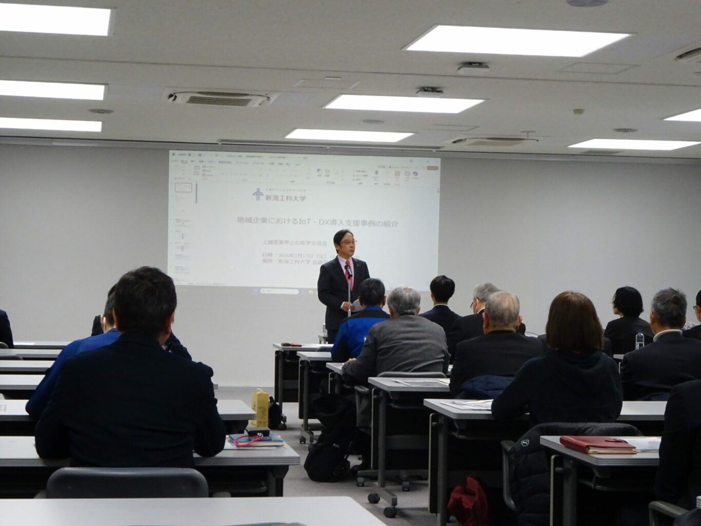 2月17日(火)、新潟工科大学を会場に、令和7年度「上越産業界と新潟工科大学との産学交流会」を開催し、上越地域の企業や産学交流会企業、大学教職員など計42名が参加しました。本交流会は、上越地域の産業界と本学との産学官連携を促進することを目的に、平成8年より毎年開催しており、今年度は企業のDX推進に欠かせない「生成AI・IoT・VRツール体験講座」をテーマに開催しました。