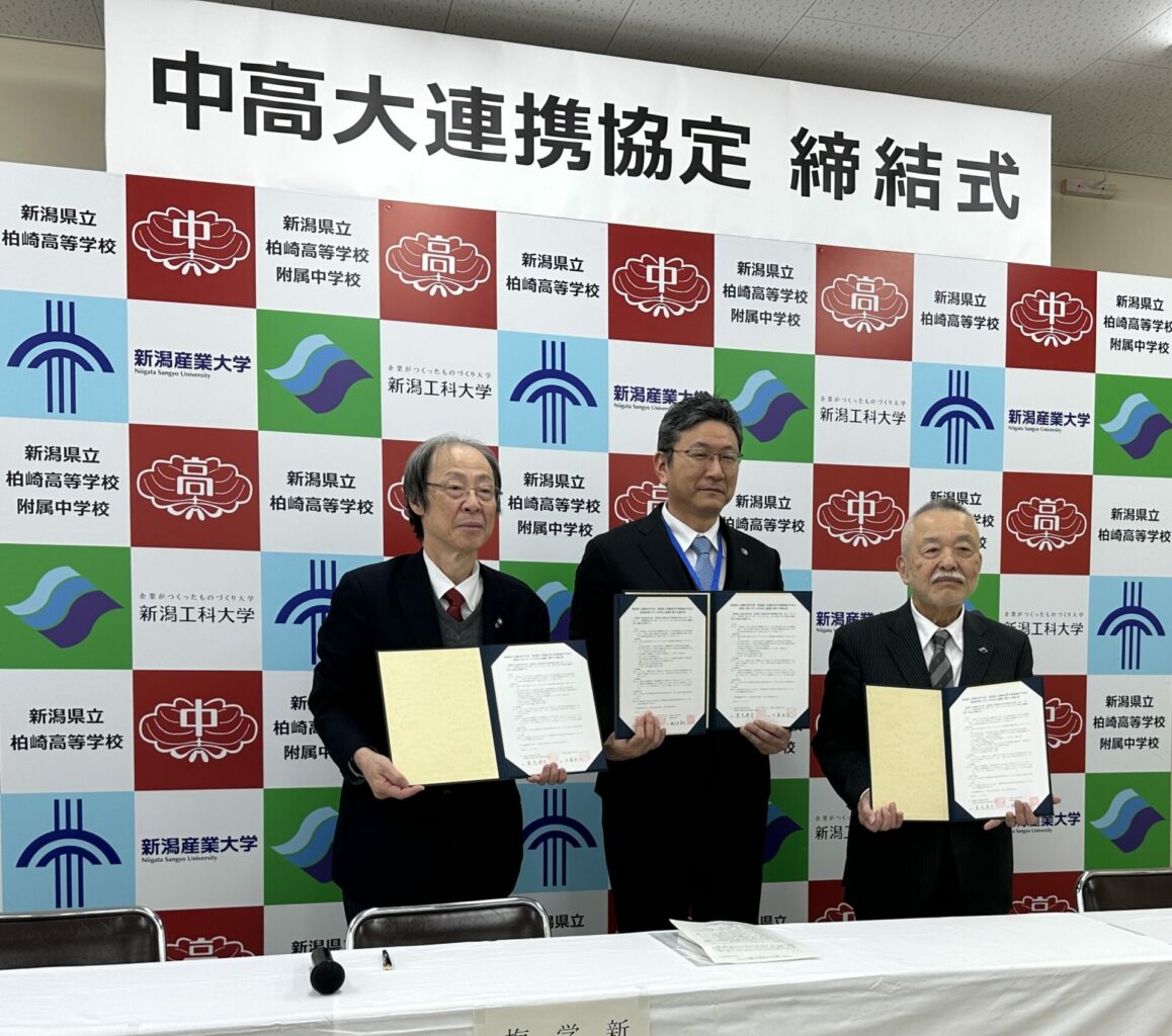 2月20日(金)、新潟県立柏崎高等学校・附属中学校と本学による中高大連携に関する協定書の締結式が同校で行われました。
