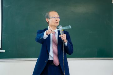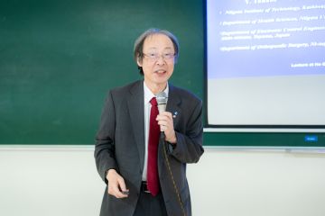訪問団一行はその後、田邊学長と岡崎正和 教授が同大の学生向けに模擬講義を行いました。英語での講義でしたが、学生たちは熱心に聞き入っていました。このほか、三浦岳大 学務課長はスライドや動画で新潟県と本学を紹介。なかでも雪の動画は好評だったようです(現地の気温は約30度)。