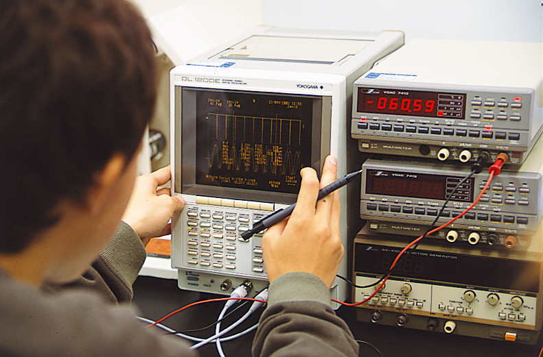 本学科の実験では、3〜4人のグループで、情報電子工学の基礎から応用までを幅広くマスターします。自分の手を動かして、自分の目で調べる。それが学問の基本です。最新のテクニックを身に付けるために用意された、最新鋭の計測器や実験装置を使って、真の学問の世界を実際に探究できます。