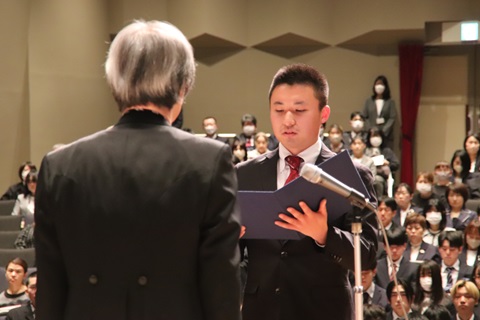 これに対し、新入生を代表して工学部工学科の荒井優奈さん、大学院博士前期課程生産開発工学専攻の石垣歩武さんが、それぞれ誓いの言葉を述べました。