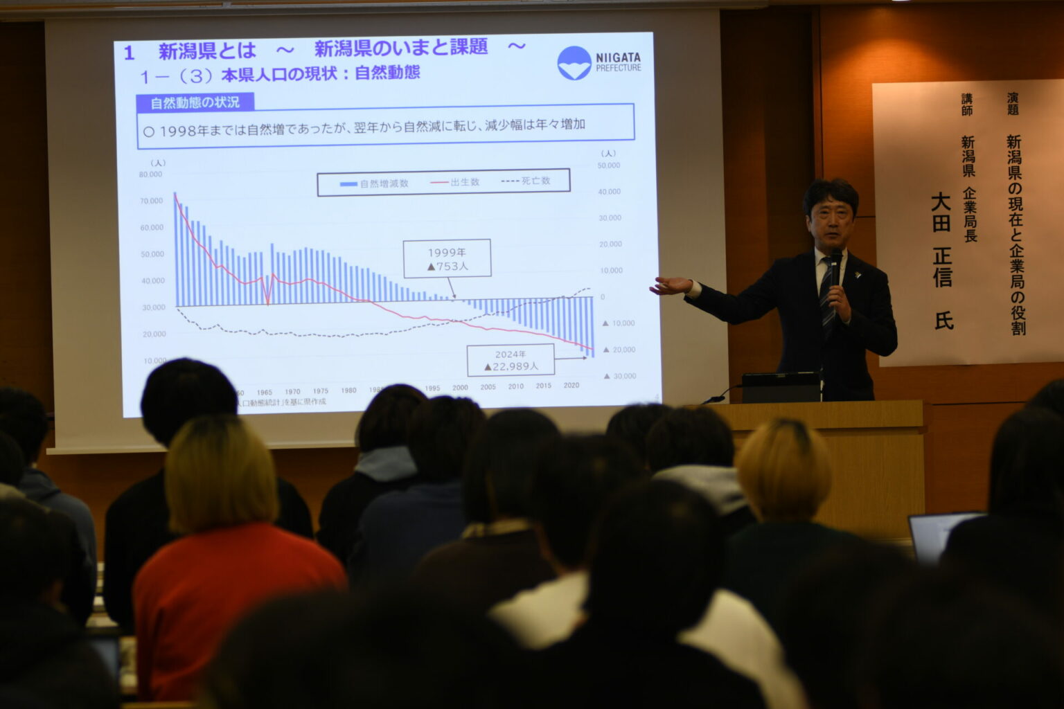 11月26日(水)4限に、産学協同科目である「産業探究」において、新潟県企業局長の大田正信氏からご講演いただきました。