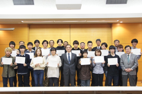 交付式では、大川学長から代表者へ奨学生証が交付され「自分の夢や希望に向かって努力することが将来の財産になる。企業の方たちも夢の実現を大いに期待している」との激励の挨拶がありました。