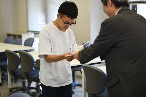 チャレンジアップ制度(5月)の表彰式を行いました。チャレンジアップ制度は学生が目標を持って挑戦をすることを奨励する制度で、在学中に学術研究活動、ものづくり、資格取得、TOEIC、課外活動において成果を修めた学生または団体を表彰し、受賞者には賞状と副賞が贈呈されます。チャレンジアップ制度の詳しい内容と過去の受賞者は、こちらをご覧ください。