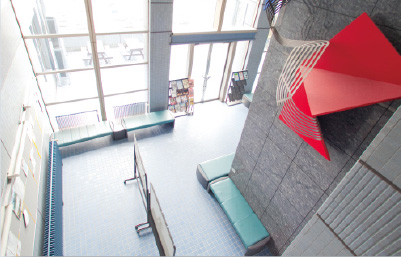 24時間使用可能なNs’スタジオのほか、売店、オープンテラスなどがあります。所々に有名デザイナーによるイスが設置されておリ、学生たちのコミュニ ケーションスペースとして利用されています。